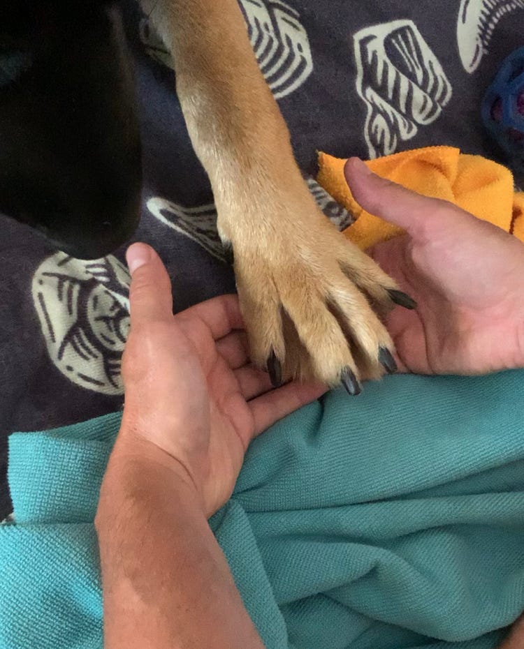 At least twice a year, Becky’s son Mike visits from Paris. He pampers Finn by bathing, massaging, and applying a pad softening balm on his paw pads. Finished off with a pedicure and nail polish (kidding). Here is the proof.
